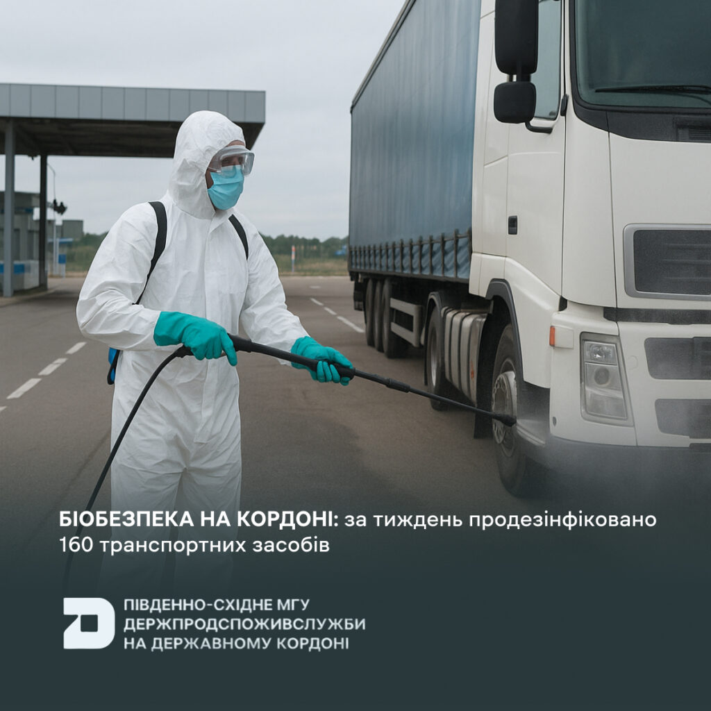 З 28 листопада по 4 грудня 2025 року фахівці Південно-Східного МГУ Держпродспоживслужби на державному кордоні здійснили дезінфекцію 160 транспортних засобів, що перетинали пункти пропуску в Одеській області.