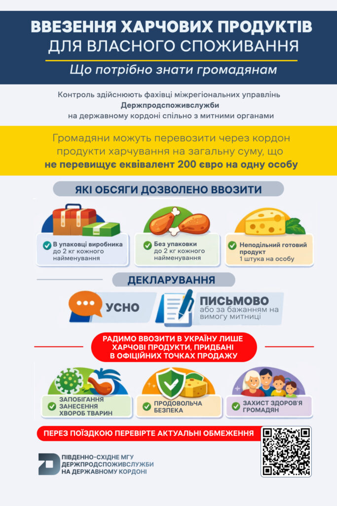 Контроль за переміщенням харчових продуктів для особистого споживання через державний кордон України здійснюють фахівці міжрегіональних головних управлінь Держпродспоживслужби на державному кордоні спільно з представниками митних органів. Основна мета таких заходів — забезпечення безпечності продукції та недопущення потрапляння на територію країни небезпечних товарів.